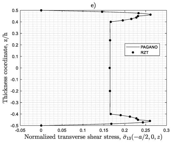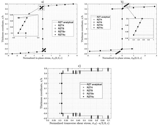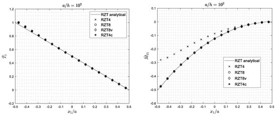 Figure 18 compares the distributions of in-plane stresses at the centre of the plates and the transverse shear stress at the midpoint of the left edge, computed using the Ritz method [] and the family of C0 RZT plate elements. For this study, in order to have a better distribution of the stresses, a regular mesh 16 × 16 for a quarter of plate has been adopted.