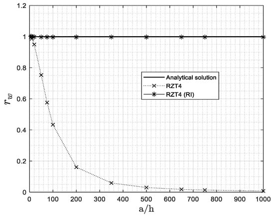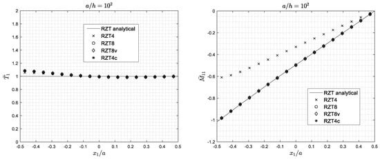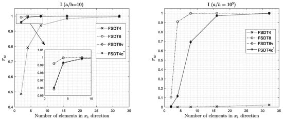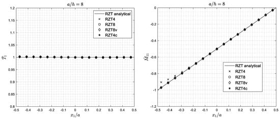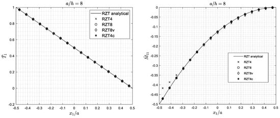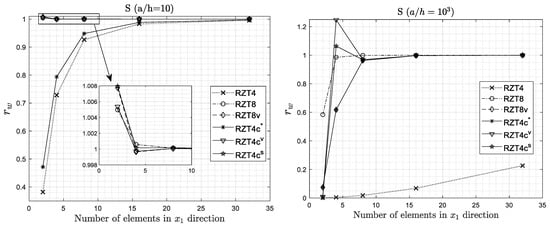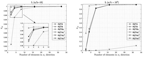 Tessler and Dong [], for the Timoshenko beam element, identified the reason of shear-locking effect in the Kirchhoff constraints of the shear strain measure for very thin structures. As a possible solution, they proposed to use the anisoparametric interpolation, where the deflection w is approximated by a polynomial with one order of degree higher than the others used for the remaining kinematic variable (bending rotation, θ). These elements, named Virgin elements by Tessler and Dong [], have one extra node in the middle beam point having only the w-dof. This approach has been extensively used to formulate C0 beam elements based on the RZT in Gherlone et al. [] and Di Sciuva et al. []. When the anisotropic interpolation scheme is applied to quadrilateral plate elements, the shape functions are bilinear for all kinematic variables except for the transverse displacement, for which the 8-node serendipity shape functions are used, i.e., the extra node in the middle point of each edges have only the w-dof (see, Table 1 and Figure 4). This plate element is named RZT8v (v stands for virgin) in Table 1: It is an RZT4 plate element for the six kinematic variables (u1, u2, θ1, θ2, ψ1, ψ2) and an RZT8 plate element for the transverse displacement, w. Therefore, the shape function matrices for the RZT8v element read (see Table 1)