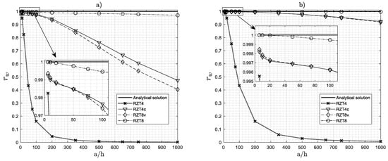 Therefore, due its good numerical accuracy (generally comparable to that of RZT8 and RZT8v elements) and low computational cost (equal to that of RZT4 element), RTZ4c quadrilateral plate element appears to be a good candidate for the FEM analysis of laminated composite and sandwich plates, mainly when nonlinear or transient linear and nonlinear analyses are involved. As a general concluding remark, the presented results show clearly that RZT8 is the most robust element among those considered in the present investigation. Moreover, as it is well known, the quadrilateral isoparametric 8-node FE is not an optimal element. The final conclusion is that further studies based on different approaches should be carried out to propose a locking-free RZT plate FE. Therefore, following Tessler and Hughes [,] suggestions, in a work in progress, the concept of an appropriate element shear correction factor is adopted in conjunction with the anisotropic constrained strategy to further alleviate the shear locking effect (extend the range of the plate aspect ratios until 106).