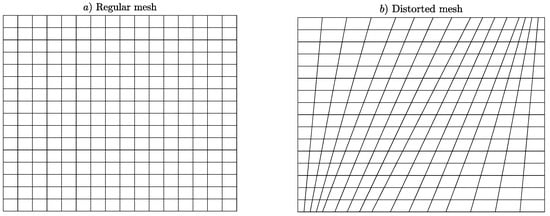 Another strategy is the assumed natural strain (ANS) method [,], which consists of interpolating the strain field at a set of chosen points, known as tying points, where the strain values coming from the quadrature points are replaced, in a weighted manner, by assumed strains. A synergic use of the DKT and ASN strategies can be found in References [,]; the discrete shear gap (DSG) method [], where the discretized shear gap field is determined by the interpolation of the nodal shear gaps. The anisoparametric interpolation strategy was proposed by Tessler et al. [] for beam finite element and by Tessler [] for plate elements. It requires that the shape functions for the transverse deflection be a complete polynomial one degree higher than the shape functions used to interpolate the bending rotations. This element was named anisoparametric virgin element []. To achieve simple nodal patterns, the constraint condition of constant effective transverse shear strain along the edges of the element is imposed. This allows one to eliminate the extra degree of freedom in the transverse deflection. The resulting element is named constrained anisoparametric, and it is simple, variationally consistent, and, more interestingly, computationally efficient.