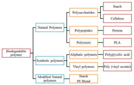 Biodegradable polymers are used for various packaging, building materials, hygiene products, and medical applications, due to their intriguing properties, such as durability, easy processing, and relatively low-cost manufacturing [45]. Biodegradable polymers can be classified according to chemical composition, synthesis method, processing method, economic importance, and applications [46]. Generally, these polymers degrade into final products like water, carbon dioxide, minerals, and intermediate products (biomass and humid materials) in a natural environment [47]. Moreover, biodegradable polymers can be derived from renewable or petroleum resources [23].