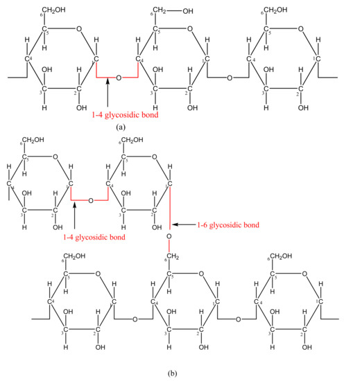 Starch, which is the second most abundant [54,55] biopolymer after cellulose [23] and one of the low-cost polysaccharides [56], is a common constituent that can be found in all organs of higher plants. Starch is the major polysaccharide chain that stores carbohydrates. Apart from the higher plants, starch can be found in mosses, ferns, protozoa, algae and bacteria. Starch is widely present in green plants and every type of tissue, including leaves, fruits, roots, stems, shoots, and pollen grains [57]. The main botanical origins of starch production are maize, cassava, wheat, and potato, respectively [58]. Starch content in potato tubers, maize endosperms, sweet potato, and cassava and yam roots varies from 65% to 90% of the total dry weight. Starch consists of two types of polysaccharides, typically known as linear amylose and branch amylopectin [59], as shown in Figure 2. Amylose is composed of D-glucose units linked by 1–4 glycosidic bonds (see Figure 2a) while amylopectin is composed of poly glucose units linked by 1–4 and 1–6 glycosidic bonds [60] (see Figure 2b). Generally, the amount of amylose and amylopectin varies according to the source of origin [57].