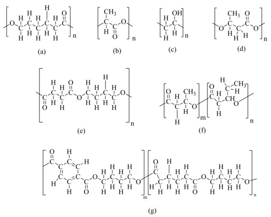 Chemical structures of (a) Polycaprolactone (b) Polylactic acid (c) Polyvinylalchohol (d) Polyhydroxybutyrate (e) Polybutylene succinate (f) Poly(3-hydroxybutryate-co-3-hydroxyvalerate) and (g) Poly(butylene adipate-co-terephthalate).