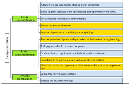 There are three major methods of compatibilization of immiscible polymer blends, namely: (i) ex situ compatibilization, (ii) in situ compatibilization, and (iii) dynamic vulcanization, as shown in Figure 4 [23]. Figure 4 illustrates the summary of the compatibilization techniques and their unique features.