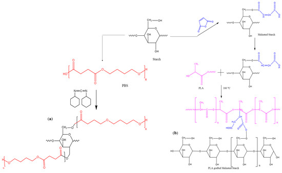 Yin et al. [24] used MA-g-PBS or rPBS (maleic anhydride grafted PBS) as an interfacial compatibilizing agent to overcome the incompatibility between both starch and PBS [24]. Furthermore, Suchao-in et al. synthesized starch grafted PBS (Starch-g-PBS) as a compatibilizer to enhance the properties of starch/PBS blends. Herein, the synthesis route during the preparation of starch-g-PBS was carried out according to Figure 5a using different molar ratios of PBS to starch for 0.63, 1, 1.5, 2.2, 3.5, and 6 mmol of dicyclohexylcarbodiimide (DCC) [37].