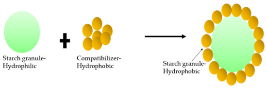 It is well-known that starch is a hydrophilic polymer since each starch monomer consists of three free hydroxyl groups in its chemical structure [23]. In contrast, synthetic polymers are hydrophobic and thermodynamically immiscible with hydrophilic starch. Therefore, simple mixing of these two polymer components may result in phase separation, phase incompatibility, and poor mechanical properties [30,35]. However, the mechanical properties of polymer blends can be enhanced by incorporating a suitable compatibilizing agent during the blend preparation [31], and this process of stabilizing polymer blends is called ‘compatibilization’ [36].