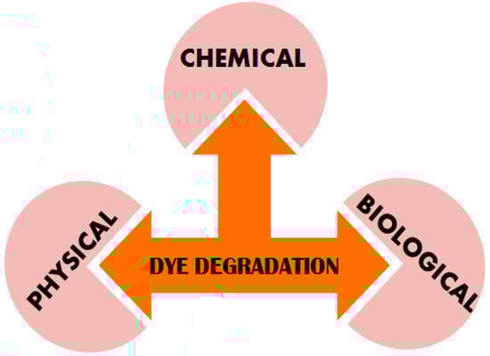 Modernized society demands for pure water have made degradation of the dyes a great challenge that needs to be addressed for the well-being of humans and aquatic life. Several physical, biological and chemical techniques have been utilized for water purification (Figure 1). Adsorption and ion exchange are the most widely used physical methods for dyes removal resulting in high quality water []. However, the most commonly used adsorbents such as activated carbon have a high cost and hence replaced by other alternatives which demonstrate good efficiency [,]. Further, this method transfers pollutants to other phases that need to be treated. Another method involves coagulation/flocculation for color removal from textile effluents is associated with high-cost reagents, which impedes their practicability. Separation processes by utilizing membranes, reverse osmosis and ultrafiltration with microfiltration help detach the dyes from larger molecules in the wastewater. These processes have limited applications due to the inherent limitations, such as high expenditure, limited versatility, elevated salt content in the waste matter, replacement of membranes and problems associated with the disposal.