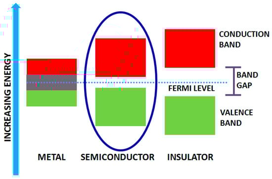 Solids, in general, possess different band gaps which result in diverse properties. Based on varying bandwidths, they are classified as metals, insulators and semiconductors (Figure 2). Solids (like metals), have overlapped band gap regardless of the temperature. The higher band is the conduction band whereas the lower one is the valence band and possesses gap for semiconductors and insulators. Bandgap in insulators is very high, and hence it is difficult to excite electrons from the valence to conduction band, and the gap is called the forbidden gap. However, in semiconductors, the bandgap is small enough for the electrons to promote from valence to conduction band at room temperature. Their bandgap lies in the range of 0 to 7 eV bounding energy levels in the visible and UV light [,]. Photocatalysis involves light irradiation on the catalyst which functions as thermal energy and hence excites the electron from the valence to conduction band of the catalyst. Therefore, the band gap’s width is the primary requisite for efficient photocatalyst, which strongly influences the electrical and optical characteristics of the material. To utilize the light from the solar spectrum, band gap engineering is the fundamental approach operated for semiconducting materials, and hence they are broadly utilized as photocatalysts.