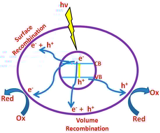 In the photocatalytic dye degradation, contaminants are destroyed utilizing transition metal oxides as efficient adsorbents, light source and oxidizing agent such as air/oxygen. Absorption of photons (with energy ≥ the band gap between valence and conduction band of transition metal oxide) results in electron transition from the valence band to the conduction band resulting in the formation of hole (h+) in the valence band and electron (e−) in the conduction band (Figure 3). Oxygen adsorbed on the photocatalyst is reduced by the electron in the conduction band, whereas the hole oxidizes the pollutant or sometimes it oxidizes water to produce •OH radicals. Here, h+ and e− act as oxidizing and reducing agents, respectively []. When reduction and oxidation do not proceed concurrently, electrons accumulate in the conduction band resulting in fast recombination of electrons and holes, reducing photonic efficiency. Hence, their consumption is a vital requirement to endorse photocatalytic performance. Various parameters such as light intensity, catalyst loading, pH, type of adsorbent, contaminant (dye) type and concentration etc. influences photocatalytic dye degradation []. Among them, this article concentrates on adsorbent properties, favorable for photo dye degradation with high efficiency.
