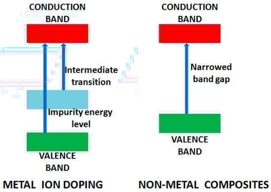 An outstanding review on metal doping for photocatalysis is reported by Carp et al. [] with the main objective of reducing the band gap of the photocatalyst and the generation of intra-states between valence and conduction band resulting in UV to visible light absorption. The doped ion alters the recombination rate by acting as a trapping center for charge carrier and modifying the surface properties by enhancing adsorption capacity. Silver (Ag) nanoparticles loaded on different semiconductors have been illustrated as an effective approach for improving photocatalytic performance [,]. The metallic nanoparticle of Ag acts as a sink to accept the photoexcited electrons facilitating the reduction process and decelerating electron/hole recombination. Ag nanoparticles have also been utilized to tune metal oxide properties, i.e., TiO2, NiO and ZnO by surface plasmon resonance []. Excited by this, a number of research groups have explored the doping of TiO2 by different transition metal ions [,,]. Vanadium doped TiO2 active under visible light illumination was reported by Klosek et al. After irradiation by visible light, excited vanadium donates an electron to TiO2 conduction band promoting the oxidation of surface adsorbed molecules []. Boron-doped photocatalyst has also been explored and displays high performance in mineralization of Methyl orange (MO) with decolorization degree of 90% in 2 min []. Alternatively, non-metal doping results in redshift of the energy which is absorbed by the photocatalyst, resulting from bandgap narrowing in which valence band is elevated (Figure 4), with no modification in the conduction band [,,].