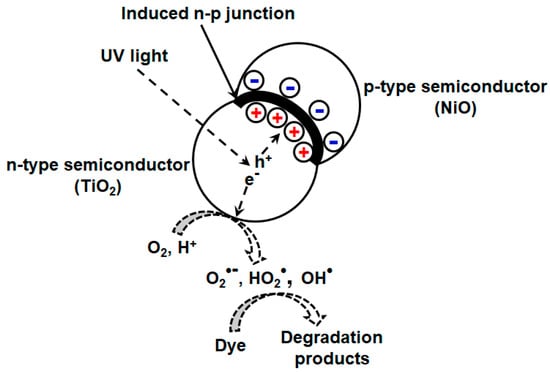 Different strategies have been reported to enhance the photocatalytic efficiency or retard the electron/hole recombination rate in mixed oxides. TiO2-NiO mixed oxide developed by sol gel method reportedly have high efficiency for photodriven MO removal []. This enhancement is attributed to the induced n-p junction at the interface, which prevents electron/hole recombination upon irradiation by light. This can be explained by (Figure 5) considering the existence of both TiO2 (n-type, electron rich) and NiO (p-type, hole rich) phases or n-p junction at the interfacial contact where diffusion of electrons and holes takes place to p-type and n-type semiconductors, respectively. At equilibrium, the internal electric field arises due to accumulation of electrons and holes, which act as potential barrier and prevent electron/hole recombination. They also investigated the variation of nickel content on catalytic efficiency of the synthesized composite. Highest efficiency was exhibited by Ti75–Ni25 composite, and with further increment in Ni content, specific surface area and total pore volume of the resulting composite diminishes, which is detrimental for photocatalytic reactions.
