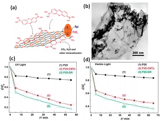 Graphene–ZnO composite was reported by adsorbing Zn+2 ions on GO sheets followed by addition of NaOH and NaBH4 []. Various graphene composites (ZnO–graphene, Co3O4–graphene, Mn3O4–graphene, etc.) have been explored for their photocatalytic application to purify wastewater [,,]. These composites showed high adsorption capacity and large charge separation facilitating overall performance. The significant role of graphene in the graphene TiO2 composite is demonstrated by Zhang et al. [] during the degradation of MB in water (Figure 6). Role of graphene and CNT were further explored by making their nanocomposites CuO.ZnO.Fe2O3/rGO and CuO.ZnO.Fe2O3/CNTs by utilizing against MB dye []. The resulting nanocomposites engendered stress in their lattice, resulting in some defects. These consequently resulted in enhanced chemical reactivity with improved efficiency owing to the newly generated electronic state resulting from varied interactions such as metal–metal, metal–oxygen–metal.