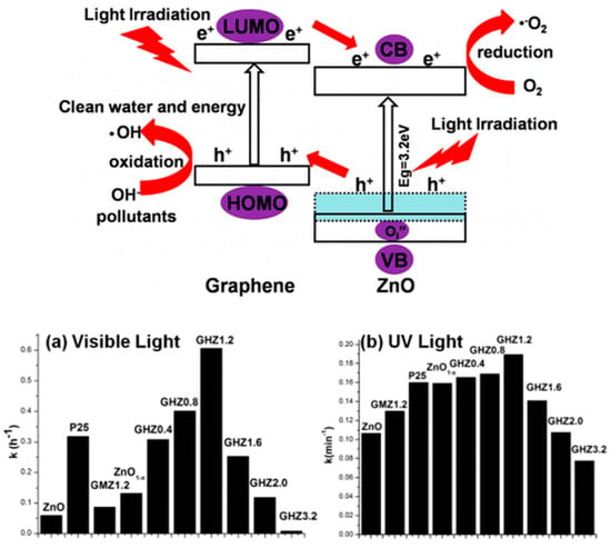 Schematic demonstrating the photocatalytic process over ZnO1−x/graphene. Photocatalytic degradation of MB over ZnO1−x and ZnO1−x/graphene under illumination of (a) visible light and (b) UV light. Adapted with permission from []. Copyright 2013, American Chemical Society.