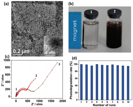 (a) Uniform dispersion of ZnFe2O4 nanoparticles over graphene (b) Images of ZnFe2O4 graphene suspension with (1) and without (2) magnetic field, (c) EIS of (1) ZnFe2O4 graphene, (2) pure ZnFe2O4 and (3) GO and (d) stability test shown by photodegradation rate of MB using ZnFe2O4-G for 10 cycles. Adapted with permission from []. Copyright 2011, American Chemical Society.