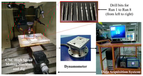 Experimental setup for drilling process and drill bits for Run 1 to 8.