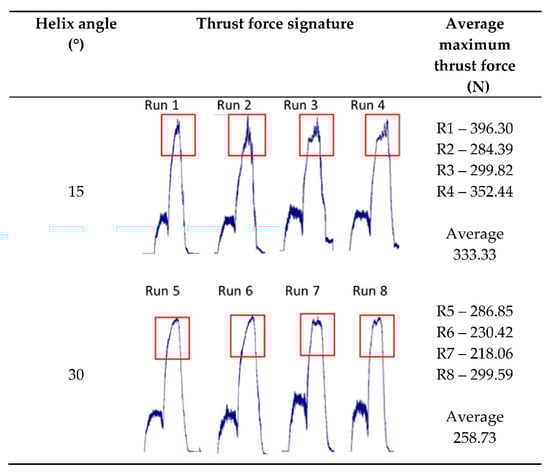 Thrust force signature for Al7075-T6 panel at 15° and 30° helix angle.