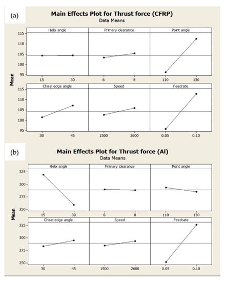 Main effect plot for the maximum thrust force (a) CFRP and (b) Al7075-T6.