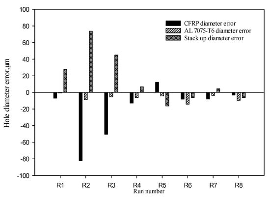 For R1, R2, R3, R4 and R7, the hole diameter error of CFRP is larger than Al7075-T6. This is largely associated with continuous chip formation. Continuous chip formation leads to chip clogging. Chips which are unable to be evacuated smoothly will remain in the hole and enlarge the CFRP holes. On the other hand, R5, R6 and R8 have larger hole diameters for Al7075-T6 compared to CFRP. This is mainly caused by the higher helix angle of 30°. A higher helix angle contributes to a higher lifting force to evacuate the chips. Therefore, the chips are able to evacuate properly and consistently. In comparison of all the runs, it is found that run R7 produced the minimum hole diameter error between Al7075-T6 and CFRP, emerging as the run with the optimum parameter combination for minimum hole diameter error.