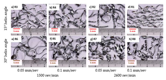 By comparing the chip formation during drilling at different feed rates and spindle speeds, as shown in Figure 7, it can be noticed that at a low speed and feed rate, continuous chips are produced, which in general reflect a higher surface roughness []. In other words, well-broken chips are preferable. As chips become longer, their movement through the flutes is less viable, which consequently leads to an increase in torque, temperature and a risk of drill breakage. At a speed of 2600 rev/min and feed rate of 0.05 mm/rev, the chip formation is optimum. Tight helical chips are formed as shown in R2 and the chips are serrated and fragmented into pieces, as in R7. When the chip is in a spiral cone chip, it is easier for them to be ejected, and hence, aid in the chip evacuation during drilling. In conclusion, short chips and tight helix chips are generally preferred to provide a better surface finish to the work-piece [].