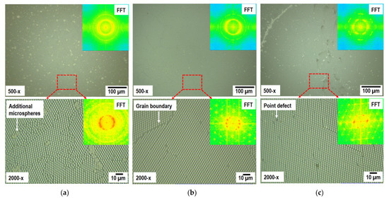 Temperature dependence of the 2D arrangement of polystyrene microspheres (P-spheres) with a 3-micrometer diameter on an Al2O3-c substrate: (a) P-spheres deposited at 20 °C using Langmuir–Blodgett colloidal lithography (LB); (b) P-spheres deposited at 25 °C using LB; (c) P-spheres deposited at 30 °C using LB. The insert images in Figure 2 represent the Fast Fourier transform (FFT) of the underlaying optical images of the LB results.