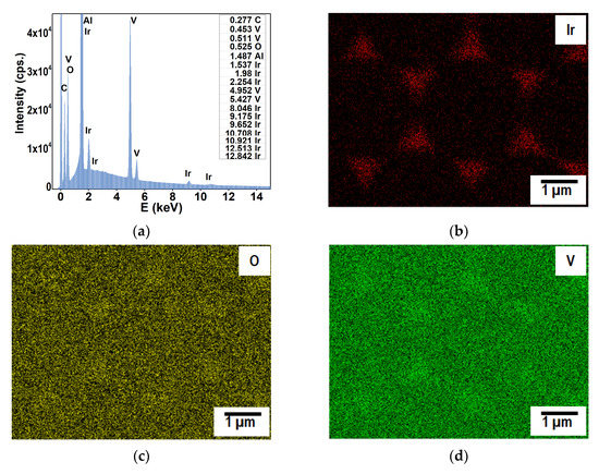 The chemical composition of the samples is assessed using Energy Dispersive X-ray Spectroscopy (EDS). In Figure 4a, EDS investigations show only the anticipated chemical elements’ (Ir, V, O and Al) presence in the samples. The Ir, V and O are associated with the composites and Al (plus O) comes from the substrate. The carbon peak is linked to a thin conductive coverage carbon layer for the EDS investigations.