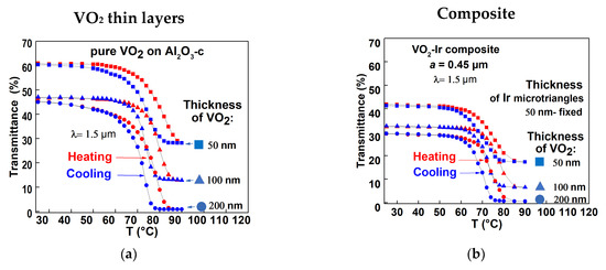The optical properties in terms of the light transmittance of VO2 are dependent on the temperature. At room temperature, VO2 is transparent to near infrared light but as the measurement is performed at a temperature closer to the MIT temperature (i.e., around 68 °C) the light transmittance decreases and can reach a minimum depending on the thickness. Characteristics such as MIT temperature, transition hysteresis and transmission contrast depend on the intrinsic and extrinsic properties of the VO2 composite. The presence of Ir microtriangles can obviously affect the quality of the transition. Figure 5 makes a direct comparison between the optical characteristics of VO2–Ir composites and original VO2 samples. Except for the metallic sketch (presence of Ir microtriangles in the composites), all the other deposition parameters are the same. Figure 5a–c shows the temperature dependence of the light transmittance of the composites vs. VO2 samples. At room temperature, the transmittance is dependent on the thickness of VO2 and on the presence of Ir microtriangles. The light transmittance measured at 1.5 µm for the composites is approximatively 15% lower compared to the one of pristine VO2 samples (for a 200-nanometer thickness). This 15% transmittance difference fits well with the approximatively 9% coverage of Ir microtriangles on the substrate surface. When comparing the optical transmittance of the composites made with 0.45 µm vs. 0.70 µm Ir microtriangles (data are not presented here) no difference is pointed out, as is to be expected since the microtriangle-substrate coverage is equivalent. If the temperature increases, all the samples show similar optical transmittance characters to reach a thickness-dependent minimum above the MIT temperature. The hysteresis areas are approximatively constant, meaning that the matrices of VO2 are preserving their flexibility in temperature.