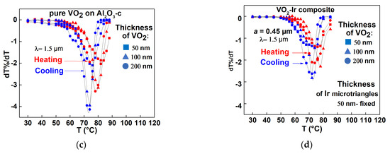 Optical characteristics of VO2–Ir microtriangles composites vs. VO2 thin films on Al2O3-c substrate: Temperature dependence of the light transmittance of (a) 50, 100 and 200 nm pure VO2 thin films; (b) composites made with 0.45 µm Ir microtriangles in 50, 100 and 200 nm VO2 matrix; (c) Temperature dependence of the first derivative of transmittance of VO2 thin films extracted from (a); (d) Temperature dependence of the first derivative of transmittance of composite made with 0.45 µm Ir microtriangles, extracted from (b).