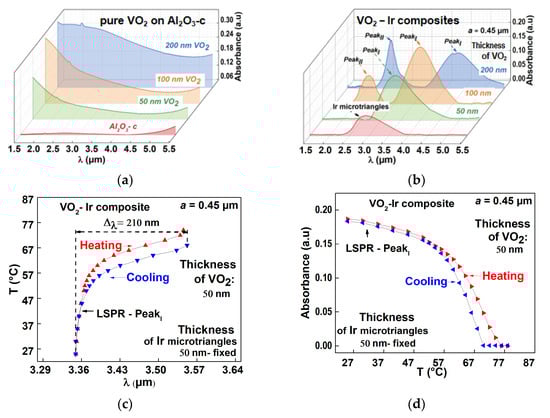The absorbance spectra of the Ir microtriangles array, without matrix contribution, show an absorption peak in the infrared part of the electromagnetic spectrum (Figure 6b). This absorption peak is identified as the localized surface plasmon resonance properties of the Ir geometric architecture and is dependent on the dimension of each microtriangle. For Ir microtriangles with the typical dimension of a = 0.45 µm (resp. a = 0.7 µm), the LSPR maximum is localized at λLSPR = 2.95 µm (resp. λLSPR = 4.40 µm) and is strongly affected by the surroundings, as shown by the absorbance spectra of the composites measured as a function of thickness (Figure 6b). The absorbance spectra of the composites are measured as a function of thickness. The LSPR peaks of the composites shift to higher wavelengths with an increasing VO2 thickness (Figure 6b). This is due to the sensitivity and dependence of the triangles’ LSPRs to the dielectric environment [30].