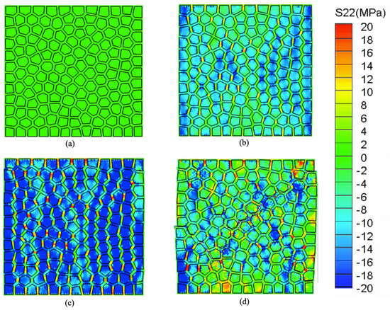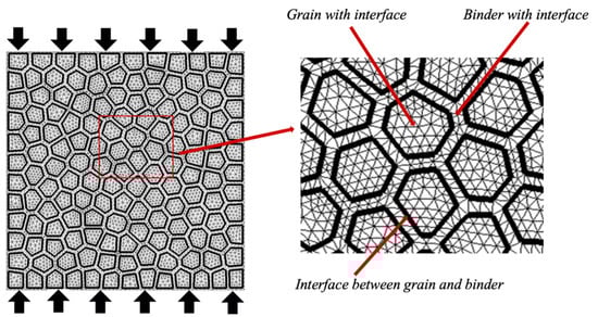 In cohesive finite element modeling, when the separation at the interface reaches its critical separation , the crack will initiate. As more cracks initiate and nucleate, they will coalesce to form big cracks. Through analysis of the fracture pattern in the specimen, we found that the cracks initiated at the interface between grain and binder. As loading increases, intergranular cracks propagated along an inclined angle via relative sliding between grain and blinder (Figure 3).