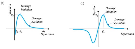 Traction–separation relations used to describe interfacial behaviors: (a) normal direction; (b) tangential direction.
