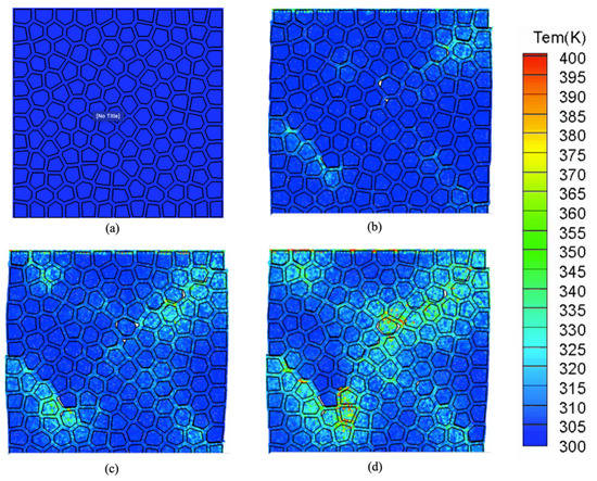 From Figure 6, we observed that the higher volume fraction of grain will generate a hot spot with higher temperature. This is because more damage will take place at the interface between grain and blinder. The possible reason is that as the grain volume fraction increases, the grain and binder interface area will increase, so more cracks may happen along the interface, more cracks will release more energy so the temperature will be higher as shown in Figure 6.