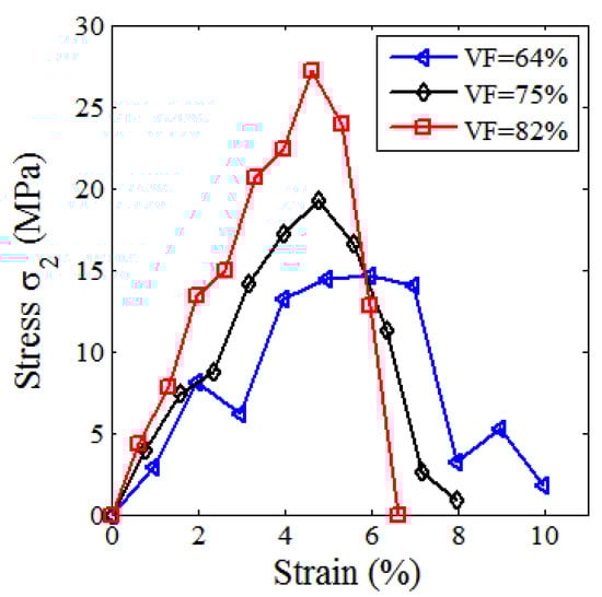 Stress–strain curves at different grain volume fraction. The results indicate that ultimate stress will increase as the grain volume fraction increases.