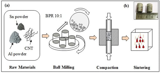 The milled Al-CNT-Sn powders with different CNT fractions were cold compacted at a pressure of 200, 300, 400, 500, and 600 MPa to investigate the compaction performance. The Al-CNT-Sn powder samples weighing 2.5 g were cold compacted in pellet dies of 10 mm diameter with a 50 kN hydraulic press. The silicon spray was applied to the die and punch to remove the specimen from the die after consolidation. Sintering was completed in a horizontal tube furnace at 530 °C with a 5 °C/min rate in an argon atmosphere and soaking for three hours. Figure 2a shows the process of fabrication. Figure 2b shows the sintered Al-CNT-Sn composite specimens.