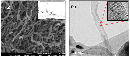Characterization of MWCNTs: (a) scanning electron microscopy; (b) high-resolution transmission electron microscopy.