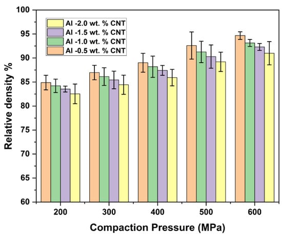 Figure 5 illustrates that as the CNT fraction increases in the specimen, the relative density declines. The reason behind this is an extremely low density of CNT as compared to aluminum and tin. It is seen that the density of composite improved with the increase in the compaction pressure applied during the specimen preparation during uniaxial pressing. The density of composites depends on various factors such as composition, size, and shape of mixture particle after milling and nature of dispersion of CNTs in the matrix. The Archimedes principle measured the bulk density of the specimen. The lowest relative density, 82.5%, is observed in 2.0 wt. % CNT composites, prepared by compaction pressure of 200 MPa; however, the highest relative density, 94.3%, is noted at 0.5 wt. % CNT composites, prepared at a compaction pressure of 600 MPa.