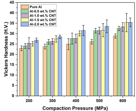 The microhardness of a material is a measure of its ability to withstand an applied load. The hardness of pure Al and Al-CNT-Sn composites is carried out on a Vickers microhardness tester (LECO LM700AT) as per ASTM E384 standards. The test was conducted at four different locations for each sample and averaged out. During an examination, the load is applied of 50 gm and a dwell time of 15 s. Figure 6 displays the microhardness at different compaction pressures for three-hour sintered samples. The investigation shows that the hardness of Al-CNT-Sn composites consistently improved with the increase in compaction pressure and CNT weight fraction. The hardness of pure Al increases by 25.81% when pressure is increased from 200 MPa to 600 MPa. With an increase in pressure from 200 to 600 MPa, the hardness of Al-CNT-Sn with 2.0 wt. % CNT is increased by 32%. As compaction pressure increases, the specimen becomes dense, and this improves the hardness in turn. The hardness of the sample, enhanced with the rise in CNT revealed from the results. By increasing CNT in Al from 0.5 to 2.0 wt. % at 600 MPa compaction pressure, the hardness of the Al-CNT-Sn composite increased by 22.85%. The solid interfacial bonds between the matrix and reinforcement and load sharing by CNT within the matrix contribute to improving the hardness of the composite. The sintering time also plays a significant role in improving the hardness [28]. The small volume of Al4C3 in Al-CNT-Sn composites observed in the XRD study also contributes to hardness enhancement. Table 2 reported the hardness and densities of Al-CNT composites fabricated through different processing routes by various researchers.