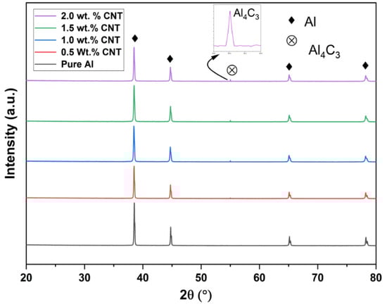 Figure 7 shows XRD patterns of pure Al and Al-CNT-Sn composites. The primary aluminum peaks ate observed at 38.8°, 45°, 65.4°, and 78.5°. A small aluminum carbide (Al4C3) peak is noticed at 55.01°. However, the aluminum oxide (Al2O3) peak is not observed in the XRD scan. The Al-CNT-Sn composites reveal that increasing CNT content results in forming a small amount of an Al4C3 phase. The sources of formation of Al4C3 are CNT and stearic acid. Generally, during milling, due to structural damage on the CNT, this leads to amorphization. The interaction of damaged CNTs with the Al matrix leads to the formation of Al4C3 [29]. Moreover, stearic acid, which is added during milling as a process control agent, is a compound formed by carbon, hydrogen, and oxygen, which accounts for the formation of the Al4C3 phase [30].