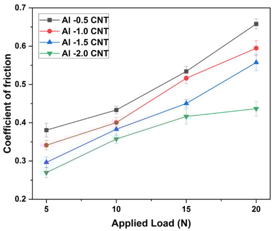 Effect of applied load on coefficient of friction for composite samples prepared with different CNT content in dry sliding condition.