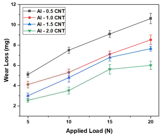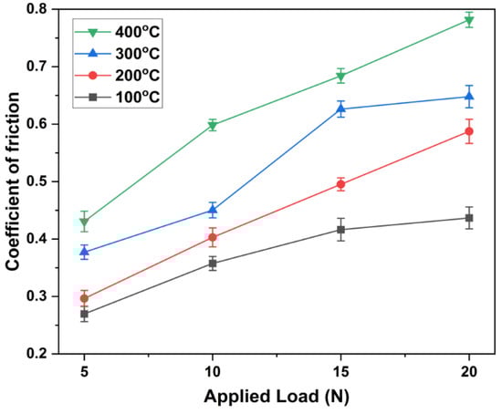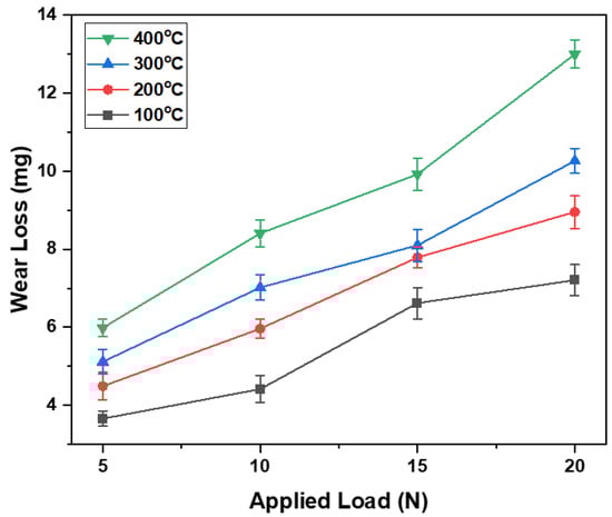 Figure 10 depicts how the coefficient of friction increases with an increase in the operating temperature of the sample. We studied Al-CNT-Sn samples with 1.0 wt. % CNT under a range of load conditions and operating temperatures. Theoretically, the coefficient of friction should decrease with an increase in operating temperature as the material softens at a higher temperature. In this case, the increment in friction coefficient might be due to the hardening effect of the specimen caused by the surge in temperature. An equal increment in coefficient of friction is noticed with an increase in test temperature by Jagannathan et al. and Kumar et al. [32,33]. Figure 11 displays the increase in wear loss with the increase in operating temperature and the applied load.