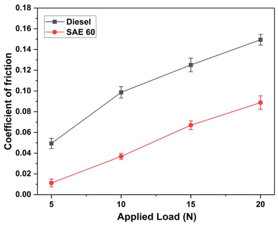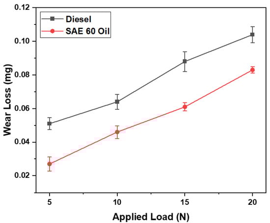 The wet wear test was conducted with SAE 60 and diesel at room temperature on Al–CNT-Sn samples with 1.0 wt. % CNT. It is found that wet conditions create a lower coefficient of friction and wear than dry conditions. A lower coefficient of friction and wear occurs due to lubrication between the pin and disc, caused by oil. The lowest coefficient friction, 0.011, and wear loss of 0.027 mg are noticed for SAE 60 oil for 5 N load. With diesel, the coefficient of friction and wear loss is witnessed higher compared to SAE 60 oil. As with dry sliding conditions, with increasing load, friction and wear loss increase for wet conditions. The SAE 60 oil has better lubricating properties as compared with diesel which is primarily fuel. The coefficient of friction and wear loss comparison of SAE 60 oil and diesel oil is shown in Figure 12 and Figure 13, respectively.