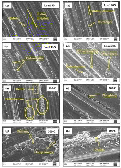 SEM images of worn samples of Al-CNT-Sn composite with 1.0 wt. % CNT: (a) dry sliding wear with 5 N load at room temperature (RT); (b) dry sliding wear with 10 N load at RT; (c) dry sliding wear with 15 N load at RT; (d) dry sliding wear with 20 N load at RT; (e) wear at 100 °C with 20 N load; (f) wear at 200 °C with 20 N load; (g) wear at 300 °C with 20 N load; (h) wear at 400 °C with 20 N load.