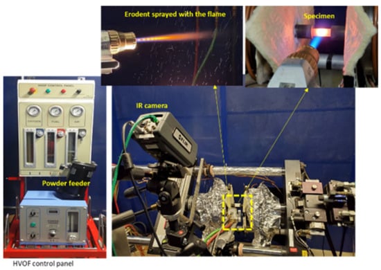 Combustion test rigs, such as high velocity oxygen fuel (HVOF) burners, are ideal sources for elevated temperature (>2000 °C including axial and through-thickness thermal gradients), high velocity (up to ~950 m/s or 1700 m/s depending on the nozzle) and relatively high water contents (up to ~0.4 atm depending on combustion condition) more in line with engine applications [24,25,26]. An HVOF designed for particle spray deposition also has the added benefit of incorporating a particle feeder that enables simulation of high melting point hard particle erosion [27] or lower melting point sand ingestion, which results in molten glass deposition on the surface of the material, i.e., CMAS (calcium-alumina-magnesium-silicate). In this study, we highlight the use of an HVOF burner rig with the capability of uniaxial load conditions to apply stress-cycle and/or thermal/velocity conditions at temperature. The focus in this work will be the burner rig exposure of CMCs under a variety of stress/temperature/environmental conditions; however, the facility is ideal for CMC/EBC or metal/TBC systems as well. Some of what has been presented here has been published in earlier works [25,26,27] that will be highlighted and discussed as well as newer work aimed at elevated temperature, higher velocity conditions.