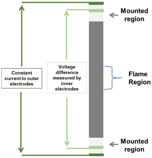 Resistance was measured via the four-point probe technique in some tests to monitor changes in resistance that could be correlated with temperature changes and/or damage development. The current and potential drop leads were placed at the ends of the specimen, as shown in Figure 2, in the region of either the grips or mounting fixture (if no load is applied), which is well insulated and far from the flame.