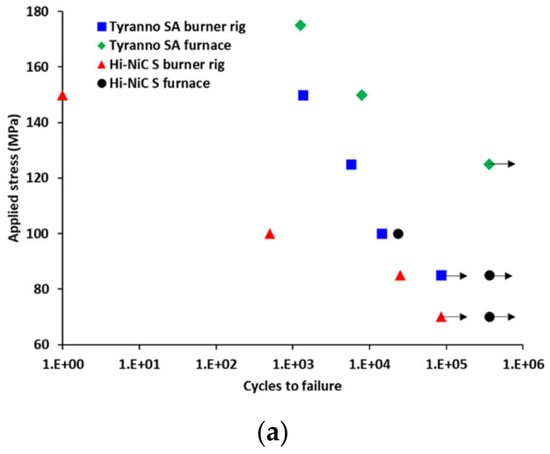 (a) Stress vs. cycles to failure for HNS and SA MI composites subject to burner rig and resistance heated furnace environment with maximum temperature of 1200 °C. The burner rig exposure resulted in a through thickness thermal gradients for (b) HNS MI and (c) SA MI, respectively. (After [25,26]).