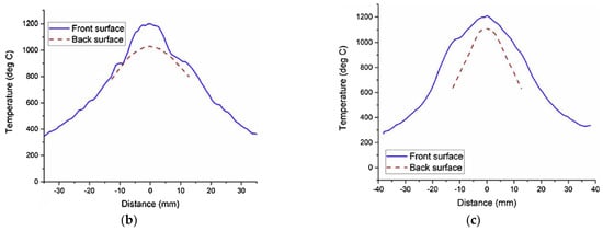 Historically, most elevated temperatures under stress conditions have been performed using furnaces where there is an axial temperature gradient but relatively uniform temperature “hot zone” of some length. The high velocity burner rig environment subjects the specimen to not only an axial thermal gradient, but also a significant through-thickness thermal gradient. Figure 3a shows the more severe degradation of the burner rig environment compared to the resistance heated furnace environment subject to fatigue (1 Hz, R = 0.1) for a max temperature of 1200 °C for an HNS and SA MI woven composites [25,26]. The burner rig environment resulted in at least an order of magnitude shorter lifetimes compared to the standard furnace environment. The front and back side temperature profiles of the burner rig tests for the two composite systems are also shown (Figure 3b,c). The through-thickness thermal gradient for HNS was about 175 °C, whereas for the SA composite it was about 100 °C. The difference in thermal gradients was most likely due to the different thicknesses of the specimens: 2.7 mm for HNS and 2.0 mm for SA.