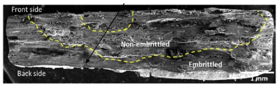 The typical phenomena of stressed-oxidation embrittlement [30,31] where oxidation through surface cracks results in the internal oxidation of interphases, fibers and matrix causing the strong bonding of fibers to the matrix was evident in the fracture surfaces for both the furnace and burner rig tested specimens from fracture surface analysis. However, one feature that was unique for many of the SA burner rig specimens was that oxidation embrittlement was more prevalent from the backside of the specimen compared to the front side (Figure 4). It is presumed this was due to the thermal gradient. If the front side is at a higher temperature than the back side under load, then the front side will relieve some stress due to higher thermal strain that must be compensated for on the back side, which should result in larger crack openings enabling greater environmental ingress into the specimen.