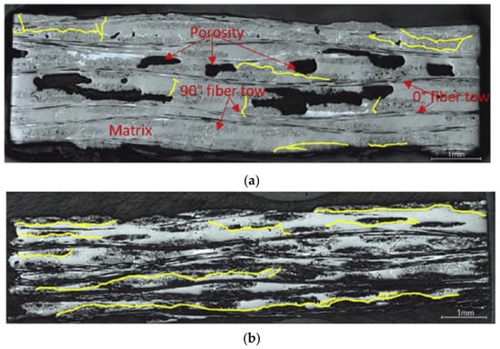 The second feature observed for both composite types under burner rig and stress exposure was the presence of longitudinal crack formation (Figure 5). This must be due to the more complex stress state imposed by the applied stress and thermal gradient. There were no longitudinal cracks observed in any of the furnace-tested specimens. The enhanced damage would interact with more typical transverse cracks to increase pathways for oxidation ingress as well as reduced local modulus. There are significant large pores in the HNS MI panel composite (Figure 5a), which is expected to increase the ingress of oxidizing species and increase the propensity for interlaminar cracking. Nevertheless, interlaminar cracking was never observed for the furnace-tested specimens and occurred in both the HNS and SA composites.