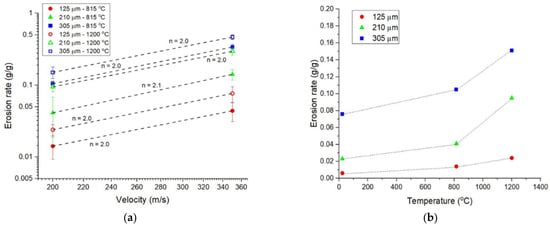 Erosion rate as a function of (a) velocity at 815 and 1200 °C under normal incidence impact conditions and (b) temperature for three particle sizes under normal incidence impact conditions at a velocity of 200 m/s. After [27].