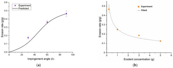 Figure 7 shows the effects of the impingement angle and erodent concentration at 1200 °C on erosion for the largest particle size powder (305 micron) at 350 m/s. Erosion is greatest at an impingement angle normal to the specimen surface and decreases as the angle is decreased (Figure 7a). The “predicted” line shown in Figure 7a is the prediction assuming elastic fracture mechanisms controlling the erosion of the normal incidence condition (n = 2). The fact that the erosion rate at lower angles of incidence is higher than the prediction implies “ductile” or ploughing mechanisms that enhance the removal of material. When the erodent concentration is increased per erodent iteration (the baseline used was 0.2 g), the erosion rate decreases, though erosion itself may increase. The decrease in the erosion rate is most likely due to the increased interaction of erodent particles where particle-to-particle collisions occur prior to impacting the substrate material, thereby lessening or negating the contribution of some of the particles to erosion. These data demonstrate that for modeling erosion for CMCs, it is important to understand the concentration of erodent particles for jet engine applications when using composites.
