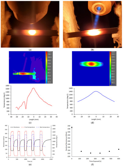 Collection of representative features of 1650oC surface temperature, 1700 m/s HVOF burner rig exposure: (a) front side image, (b) back side image showing HVOF nozzle and blue flame, (c) front side thermal image and line scan for axial thermal profile, (d) back side thermal image and line scan for axial thermal profile, (e) experimental data acquired throughout the test including front side and back side temperature as well as electrical resistance measured from the cold ends of the six inch specimen (inner four-point probe lead length = 130 mm), and (f) room temperature measured electrical resistance before and after each thermo-cycle iteration.
